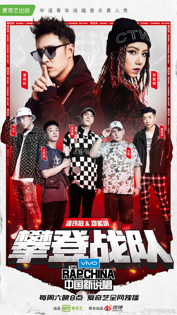 中國選秀節目「中國新說唱」以嘻哈為主題,是「中國有嘻哈」第二季,由吳亦凡,MC HotDog與張震嶽,潘瑋柏與鄧紫棋擔任導師,不僅導師陣容華麗,參賽者也都大有來頭,節目播出自今話題不斷。在最新一集的節目中,進行首輪的戰隊淘汰賽,由三組導師隨機抽選2個節拍,每隊依據抽選到的2個節拍自行分成二組進行演出,演出後,由導師評定每組戰隊淘汰一人。