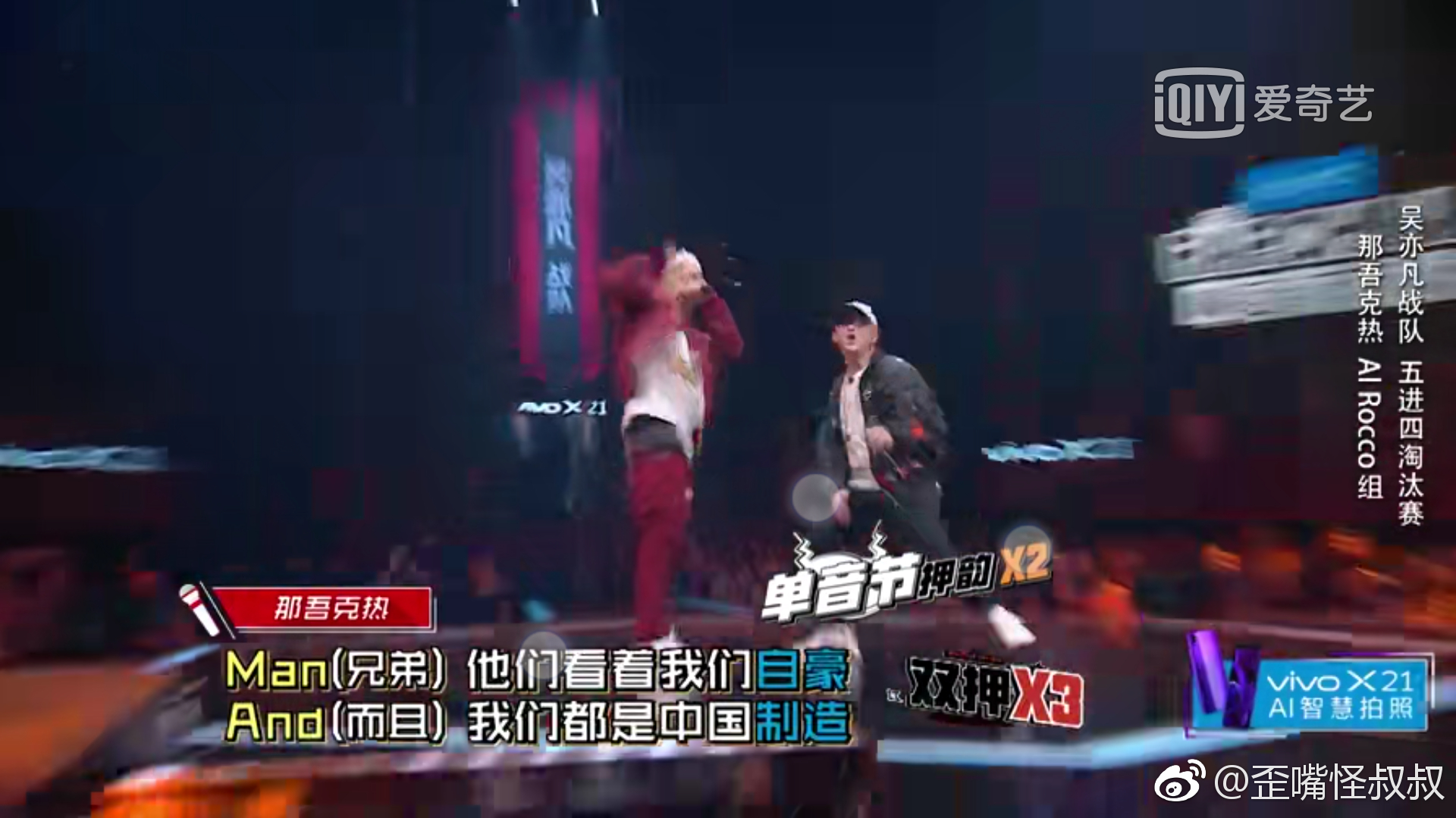 而那吾克熱也沒有辜負吳亦凡,與 Al Rocco合作的《Rep That Culture》 帥炸舞台, 再現押韻功底,兩人讓全場氣氛嗨至最高點,也是在首輪戰隊淘汰賽中唯一獲得三組導師一起起立鼓掌的演出,導師鄧紫棋更誇「兩人加在一起就是典型的1 + 1 = 3,出乎意料的炸」最終,兩人也毫無疑問直接晉級。
