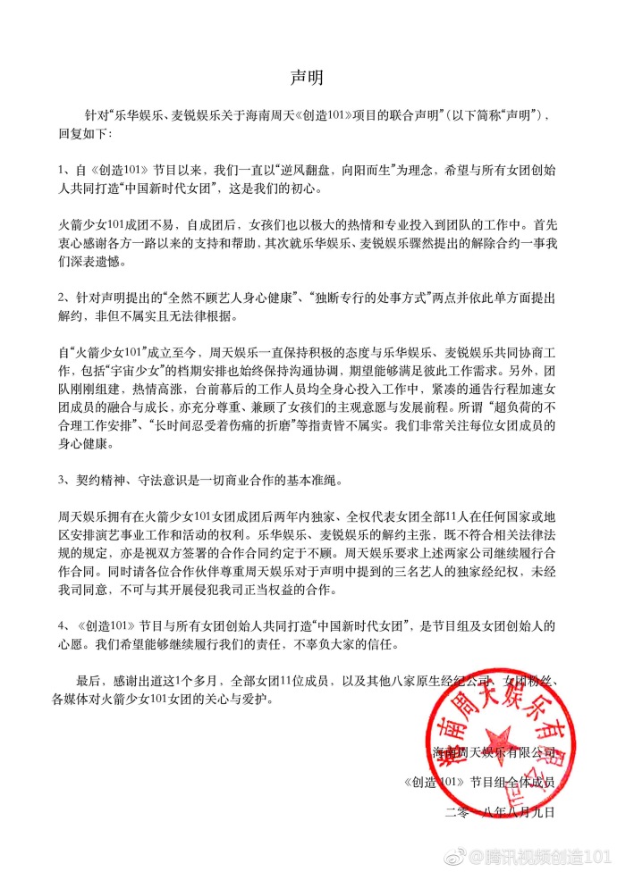 不過,9日晚間,火箭少女所屬的海南周天娛樂隨即發表官方聲明,反駁樂華、麥銳的「聯合聲明」,除一一澄清「沒有法源依據」的不實指控,也不承認兩家公司「單方面」發表聲明。