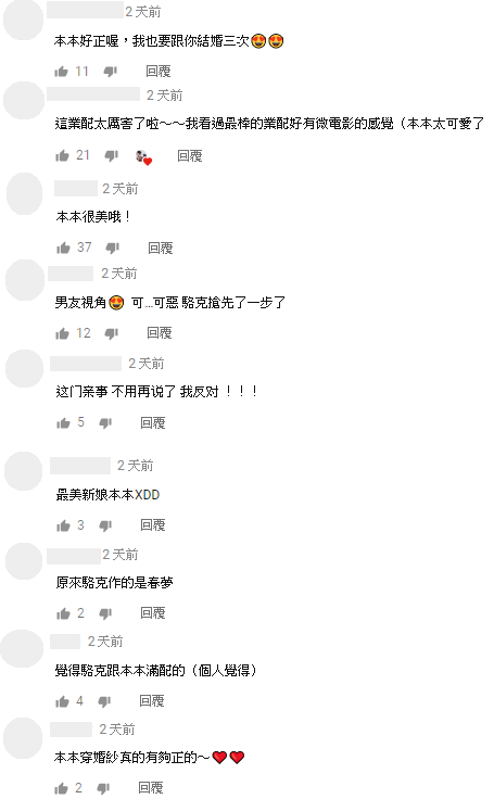 影片發布之後,網友也紛紛留言:「這業配太厲害了啦~~我看過最棒的業配好有微電影的感覺」、「本本很美哦」、「這部的重點是婚紗超美的」、「男友視角 可…可惡 駱克搶先了一步了」、「這門親事不用再說了,我反對」、「覺得本本跟駱克蠻配的」。