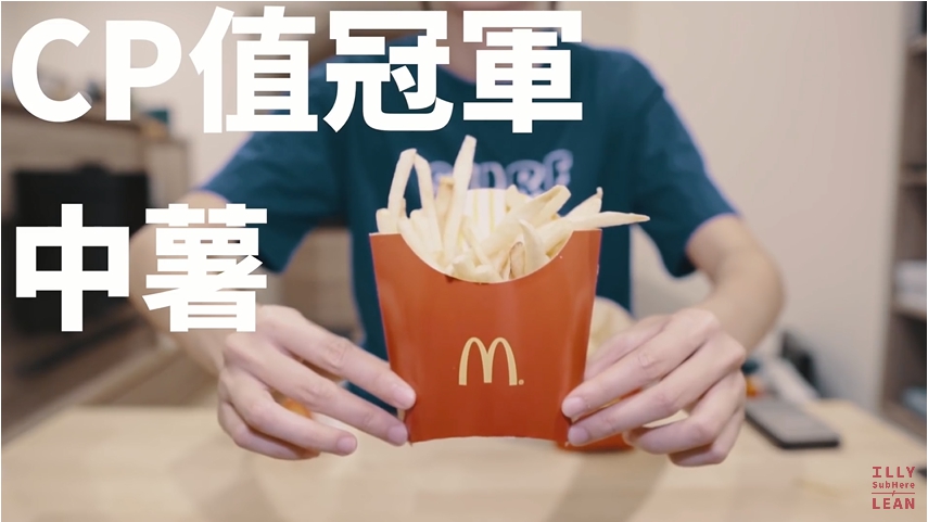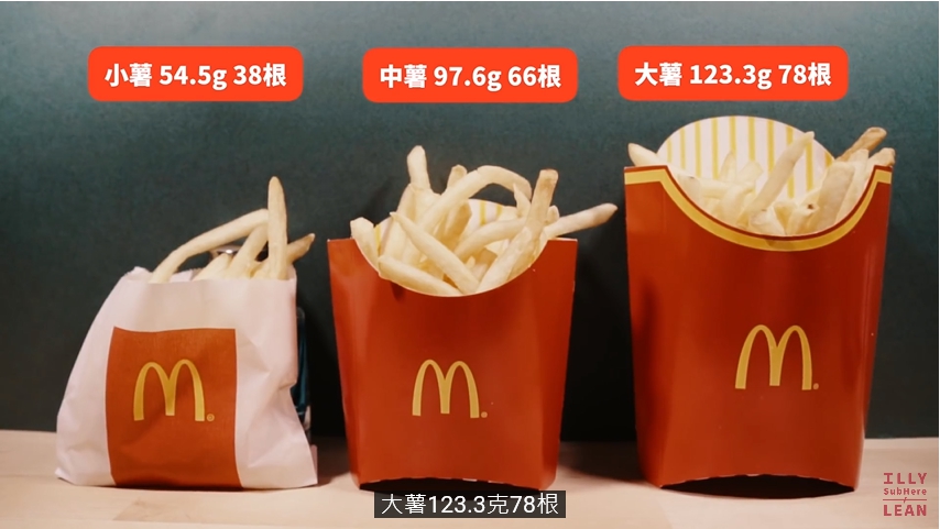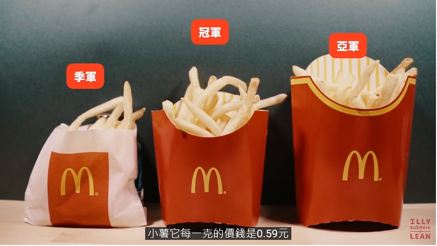 麥當勞的小薯賣32元,加10元可以升級中薯(42元),再加13元可以升級大薯(55元)。ILLY和LEAN先將三袋薯條的重量都測到小數點後一位,再用價錢來除,最後就得到每公克薯條的價錢了。結論是「中薯」是麥當勞薯條中的「CP值冠軍」,每公克只要0.43元,再來是大薯0.45元,小薯則是最不划算的,每克要價0.59元。大薯和中薯的差別可以說是人為誤差,但小薯可就真的不划算啦,下次去麥當勞點小薯的時候可要三思了。