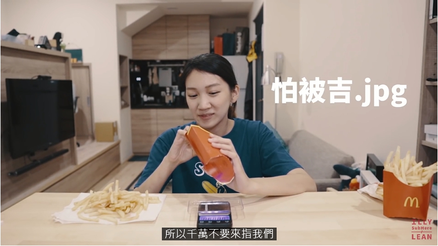 這次ILLY和LEAN為了用科學的方法求出到底哪種Size的麥當勞薯條才是最划算的,買了大、中、小三種去鹽的薯條,放在電子秤上測量。細心的ILLY連紙袋的重量都考慮到,先測了袋子本身的重量,歸零後才開始測量。量到一半他們才擔心這樣會不會被認為是針對「某M牌」,很怕「被吉」,但實驗依舊沒有中斷。