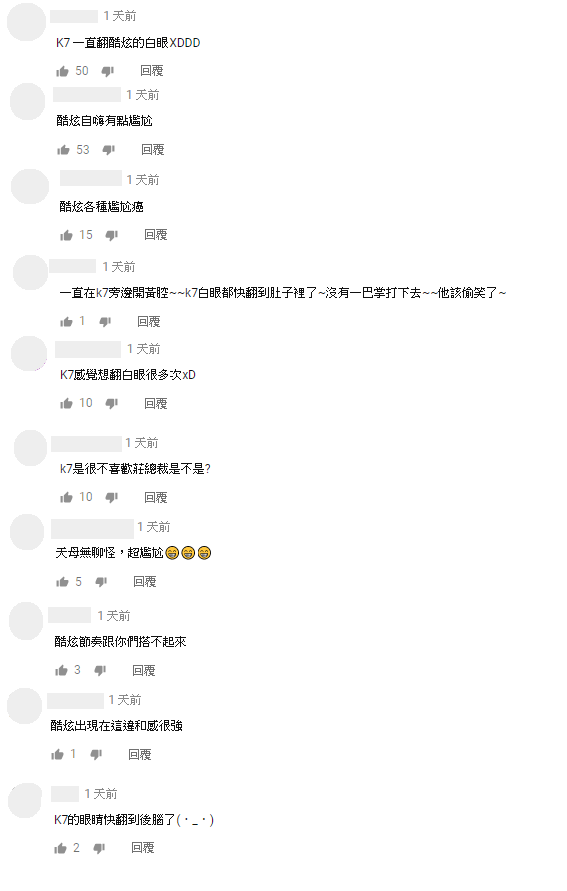 影片發布之後,網友也紛紛留言:「K7的眼睛快翻到後腦了」、「K7有點尷尬」、「酷炫節奏跟你們搭不起來」、「K7感覺想翻白眼很多次xD」、「k7是很不喜歡莊總裁是不是?」、「一直在k7旁邊開黃腔~~k7白眼都快翻到肚子裡了」、「酷炫各種尷尬癌」、「酷炫自嗨有點尷尬」、「酷炫出現在這違和感很強」。