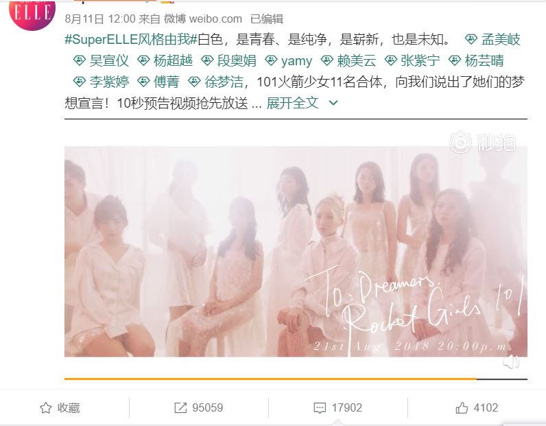 此外,好久沒有合體出現的火箭少女日前和時尚雜誌「SuperELLE」合作專欄,日前預告片已曝光,將成為火箭少女11人最後合影的珍貴畫面。在短短10秒的預告中,SuperELLE官網透露,11位團員在朦朧的燈光下,各個身穿白色上衣,充分展現青春、純潔的一面,也隱含對未來的未知。唯美的畫面讓粉絲雖然捨不得,但還是紛紛留言讚賞到,「感謝SuperELLE」、「會一直持續關注」、「繼續努力一路向前」。