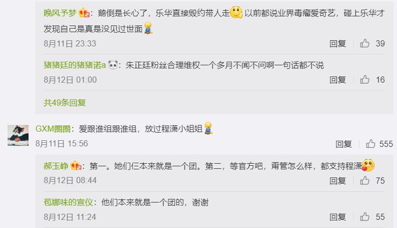 面對程瀟特別出面闢謠,網友也理性回應,「等官方聲明吧,不管怎樣都支持程瀟」、「本來就是一團的」、「這個問題應該去問樂華」。