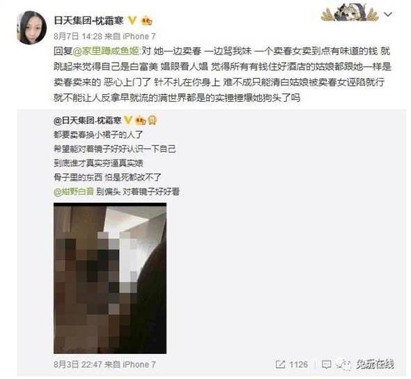 事件爆發後,網路上眾多紛紜,後來有位博主「日天集團-枕霜寒」更張貼出了有希外流不雅照寫著「都能寫個系列名字就叫『紺野白音/ 是有希董禹汐小姐的海味人生』」事件越演越烈,而目前,是有希已將她的官方微博刪除了,希望能夠早日將事件平息下來。