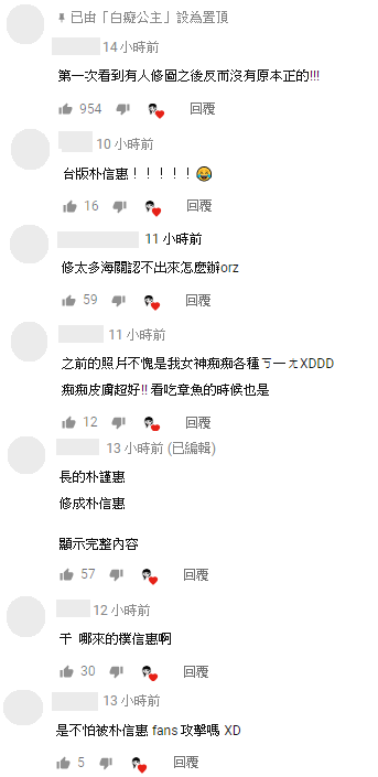 網友看見之後也紛紛留言:「第一次看到有人修圖之後反而沒有原本正的!!!」、「台版朴信惠!」、「修太多海關認不出來怎麼辦」、「白癡公主本來就很漂亮了」、「長的朴謹惠 修成朴信惠」、「哪來的朴信惠啊」、「是不怕被朴信惠 fans 攻擊嗎」。