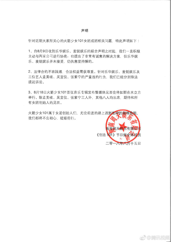 各方經紀公司互不相讓情況下,昨日孟美歧、吳宣儀和紫寧也首度同步發文回應,堅強的態度讓粉絲相當心疼。不過海南周天今日下午再度發表聲明揚言提告。聲明中先解釋,已經和樂華、麥銳積極協商,但是兩家公司都不願意接受,再者,海南周天表示兩家公司明顯違約,因此確定「分別依法提起訴訟」,最後澄清,18日火箭少女首張專輯發布會將如期舉行,但是孟美歧、吳宣儀和紫寧三人,不會出席,可見三人確定不會留在火箭少女了。