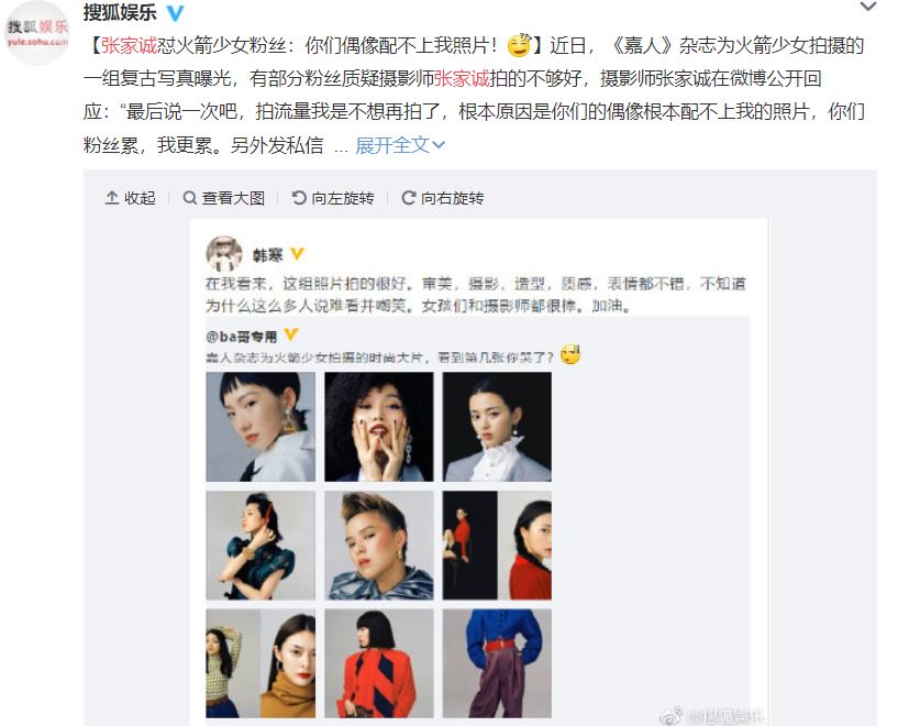 日前,火箭少女為時尚雜誌拍攝「復古照」,團員70年代的復古妝容和造型,卻引起網友負評戲稱是「上世紀的大媽」,並質疑攝影師拍照技術。對此,攝影師還公開直言到,「根本原因是你們偶像配不上我的照片」。