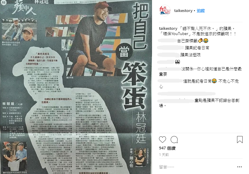 台客劇場由導演「林冠廷」經營,粉絲也暱稱他導演,近日他接受《蘋果》訪問,報導中除了詳盡介紹他的想法和理念,也介紹了他和父親、妻子之間的互動,讓許多粉絲更了解他,不過報導出來之後,因為標題用斗大的字眼「把自己當笨蛋」做引語,更在第一段提到「環保YouTuber」,讓他透過IG表達不滿:「語不驚人死不休的蘋果。『環保YouTuber』不是我追求的標籤啊!!」