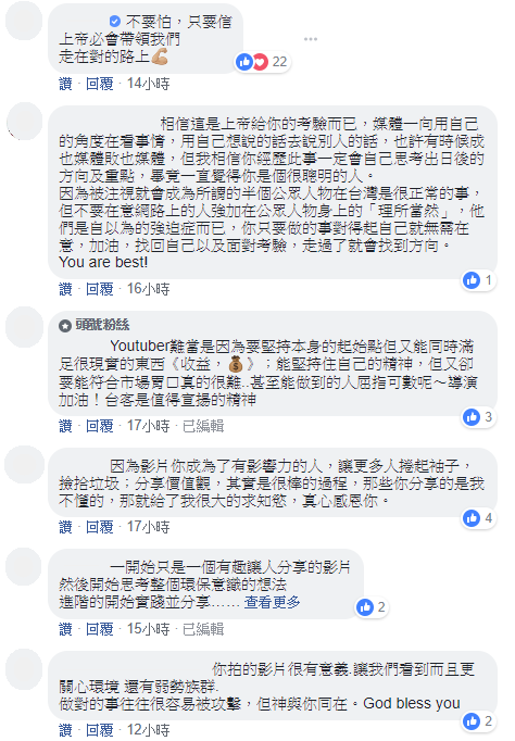 文章發布之後,許多粉絲也紛紛鼓勵林冠廷:「不要怕,只要信,上帝必會帶領我們,走在對的路上」、「我相信你經歷此事一定會自己思考出日後的方向及重點」、「導演加油!台客是值得宣揚的精神」、「那些你分享的是我不懂的,那就給了我很大的求知慾,真心感恩你」、「你拍的影片很有意義.讓我們看到而且更關心環境」。