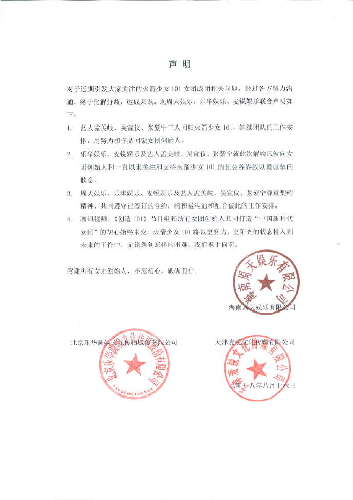 火箭少女孟美岐、吳宣儀和紫寧三人退團在樂華、麥銳和海南周天三間公司的相互角力下,讓外界不僅心疼三人,也懷疑是公司炒作話題。根據「火箭少女101」官方微博今早指出,各方經紀公司已「達成協定」,讓三人回歸火箭少女,但由於報名程序問題三人將不會出席18日的首張專輯發布會。