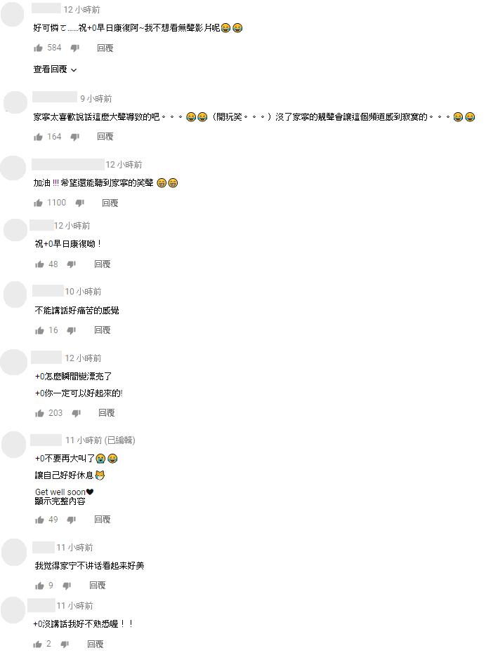影片發布後,網友也留言:「祝+0早日康復阿~我不想看無聲影片呢」、「家寧太喜歡說話這麼大聲導致的吧」、「加油 !!! 希望還能聽到家寧的笑聲」、「+0不要再大叫了」、「我覺得家寧不講話看起來好美」、「超想念+0的聲音der」、「祝我們的 +0早日康復啊」、「 +0沒講話我好不熟悉喔」。