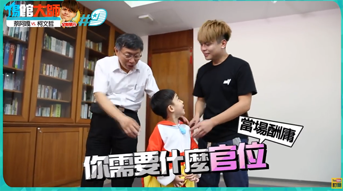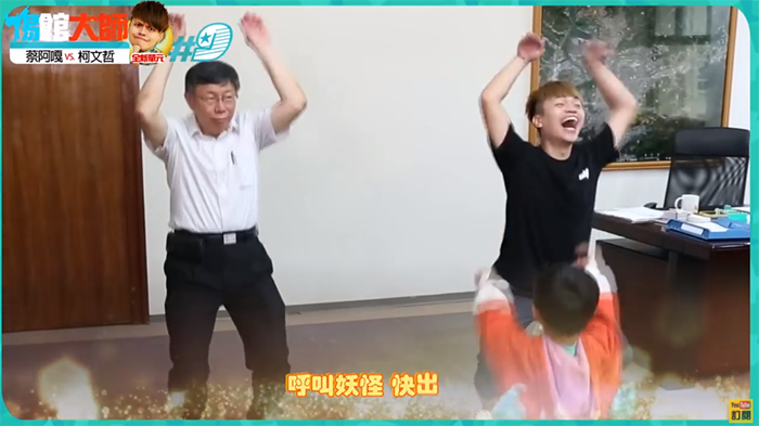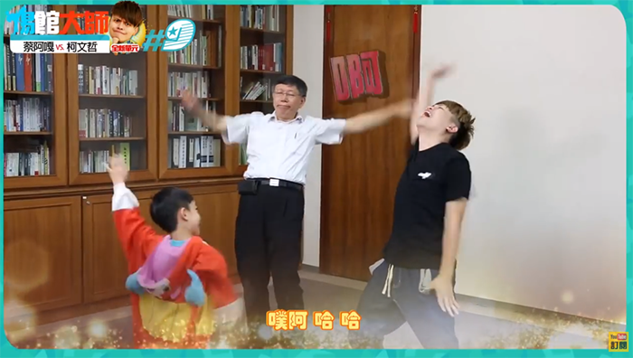 柯P這次和蔡阿嘎比拚「體力」,也相當配合和阿嘎一起跳妖怪手錶,親和力爆表。有趣的是阿嘎特地找了一位小朋友當評審,跳完之後小朋友則給了柯P1000分、阿嘎100分,讓阿嘎超沒面子,他也幽默質問柯P:「市長你不能這樣給小朋友賄賂」,接著柯P立刻開玩笑對小朋友說:「你想要什麼官位」,後來阿嘎便表示小朋友沒有投票權,柯P則再度自嘲:「我的支持者都沒有投票權」。