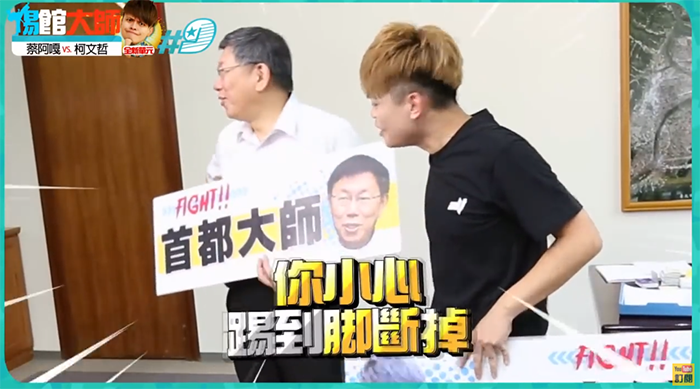 阿嘎在片頭便大放厥詞表示:「他就是個歐吉桑嘛,他不務正業出來當市長他會當嗎?醫師當什麼市長,拿我們這個人民的幸福開玩笑」,不過柯P聽見阿嘎要來踢館之後,幽默表示:「你小心踢到腳斷掉」,阿嘎則繼續嗆聲:「你今天如果輸了,下屆直接不要選了」表示要柯P梭哈下去沒贏就退選,不過柯P則回應:「這次不管輸贏都要選,下次一定不選了」以示連任決心,更搞笑表示自己為了選舉都要沒錢了。