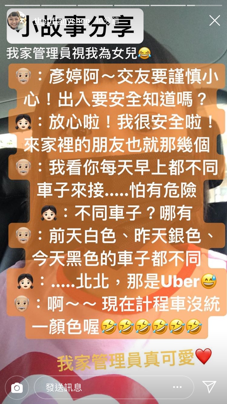 弄清楚真相後彥婷哭笑不得,原來管理員看到的是她叫的「Uber」,才會每天都是不一樣的車。解釋清楚之後伯伯感嘆道「啊,現在的計程車都沒有統一顏色了喔」爆笑的神展開也令彥婷趕緊將故事PO上IG,分享這則有趣又可愛的小故事給粉絲們。