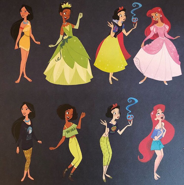 ▼現在畫師 Jon York 就依照著過去《無敵破壞王 2》曝光的獨家劇照和電影預告,來繪製出 14 位迪士尼公主完整的禮服和私服大對比,立刻就在網路上引起瘋狂轉發。可以看見《公主與青蛙》(The Princess and the Frog)的蒂安娜公主將頭髮放下來後變成可愛的俏氣捲髮,而她的現代風衣服也是以明亮的綠喪和黃色為主。白雪公主的 T 恤上印有毒蘋果的圖案,而《小美人魚》(The Little Mermaid)愛麗兒則是選用了像是大海般清爽的藍綠色休閒服。