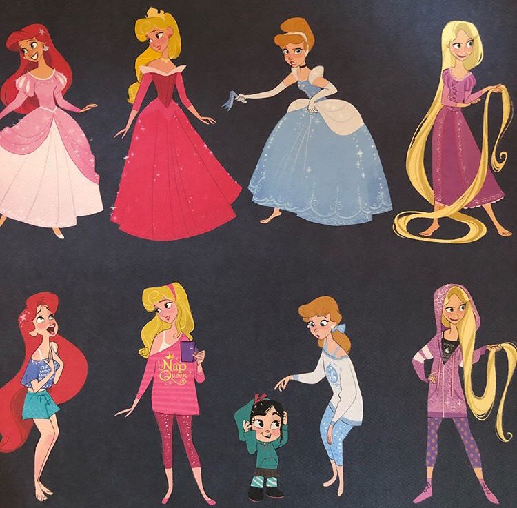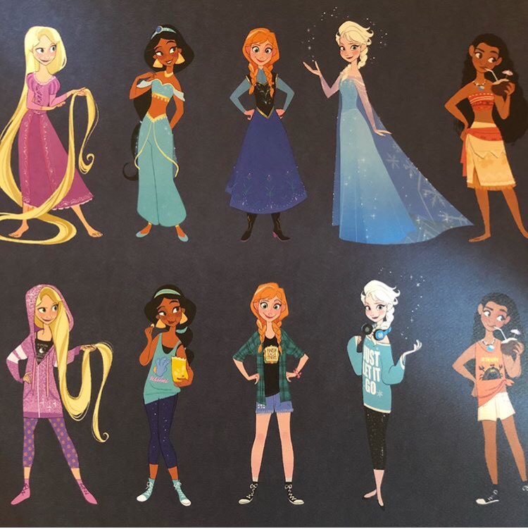 在《無敵破壞王 2》敲碎玻璃鞋當作武器出名的「不良公主」灰姑娘,睡衣同樣是寬鬆的白色大 T 恤搭配藍色 Legging。《冰雪奇緣》(Frozen)的姊妹檔艾莎女王與安娜公主換上現代風衣服之後,以格子襯衫搭配熱褲、帆布鞋的安娜反而更顯得孩子氣。