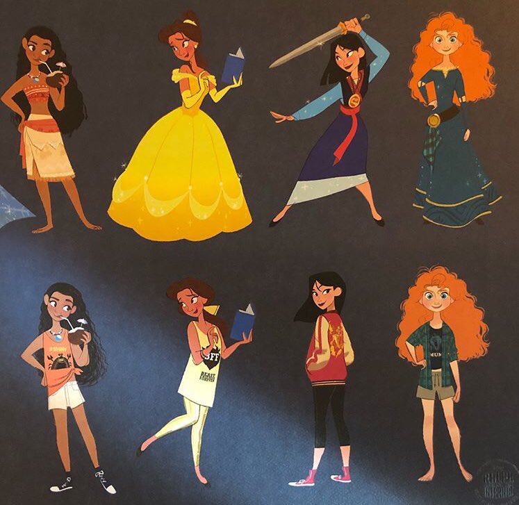 《美女與野獸》(Beauty and the Beast)貝兒則換上了整套淡黃色的輕便家居服,原本穿著中國古風服飾的花木蘭,則是被配上了有著木須龍刺繡的紅色棒球夾克,搭配黑色 Legging 呈現出中性風。而在預告中被笑說是從不同公司來的《勇敢傳說》(Brave)梅莉達公主,則是跟她弓箭手野性的背景一樣,換上了輕便而率性的休閒服。這一系列的迪士尼公主禮服和私服大對比,讓更多公主粉感到興奮:「求迪士尼快出周邊 T 恤,我肯定會買!」、「喜歡木蘭的外套」、「想要艾莎 Just Let It Go 的 T 恤」