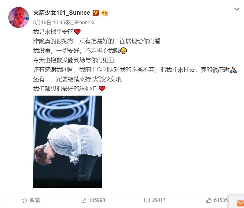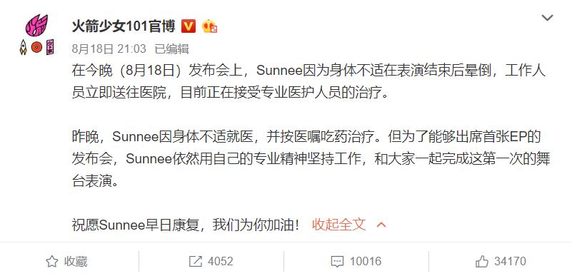 當天晚上,火箭少女官方微博發文解釋Sunnee的身體狀況。文中透露,Sunnee早在發布會前一天晚上就已經掛病號,但是為了出席首張EP發布會,她堅持要出席和大家一起完成首次的舞台表演。