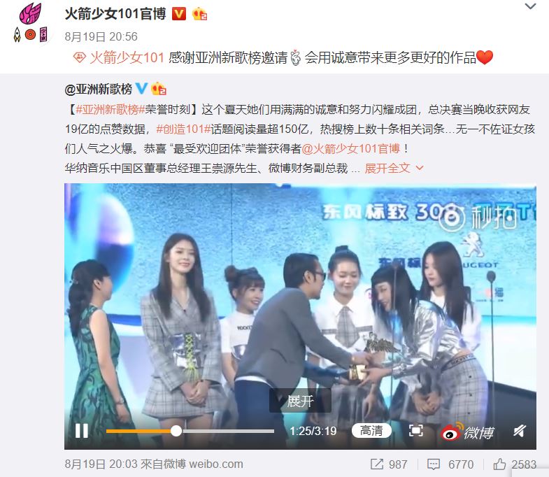 幸運的是,火箭少女最終在亞洲新歌榜中奪得「最受歡迎團體獎」成功突破此前難關。典禮當天,由隊長Yamy接下「最受歡迎團體獎」,她也表示這個獎項給予正在宣傳新專輯的他們很大的信心。從訪問中,每一位團員都分別感謝對粉絲的一路支持,針對媒體詢問歷經退團風波感受,賴美云認為這是必經之路,並表示「這些考驗會讓他們更堅定,會給大家更多的作品和更好的火箭少女101」。
