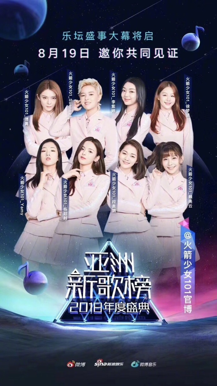 「火箭少女101」是由中國大型選秀節目《創造101》最終選拔出11位少女出道,先前孟美岐、吳宣儀和紫寧三人退團,如今團體內只剩下8位成員,雖然風波不斷,但「火箭少女101」仍然挺過了這些困難,在18日發布會上表演了首張專輯中同名主題曲《撞》,獲得好評,也讓粉絲們看到成員的進步,她們的高人氣使她們在亞洲新歌榜上獲頒2018年度最受歡迎團體之榮譽。