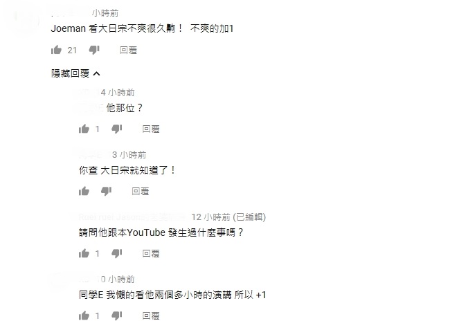 剛被Joeman超越的頻道「大日宗」是由宋七力創立的宗教團體,宋七力早年曾自稱會「分身術」,有過斂財的爭議,登上各大媒體引發討論,現在他也將演講放在Youtube上供人點閱,有破百萬人追蹤。不過觀眾的年齡層大都偏高,許多年輕人不知道這號人物,紛紛疑惑的留言「大日宗是甚麼東西 ? 」、「Joeman不講都不知道有大日宗這個頻道」、「Joeman 看大日宗不爽很久齁!」
