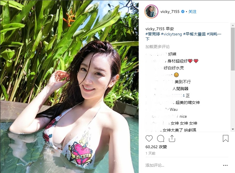 一開始PO出了一張在泳池玩水的照片,穿著白色比基尼,背對著鏡頭,秀出大片美背,不少人看了狂敲碗請女神「轉正面!」結果相隔短短一個小時,曾莞婷就出來滿足粉絲心願,大方曬出正片照,穿著同款比基尼入鏡,面對著鏡頭,大方展現豐滿胸圍。