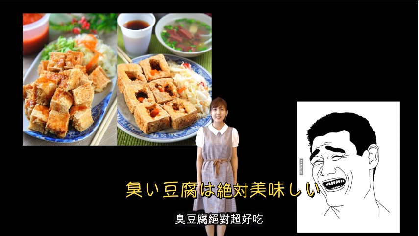 黃小玫也在影片中放了各種台灣美食的照片,如肉圓、夜市小吃等等,並將最人氣的伴手禮烏魚子、烏龍茶、鳳梨酥等等也都羅列了一遍,然而她也不忘記向日本人力推聞起來很臭卻十分美味的臭豆腐 !