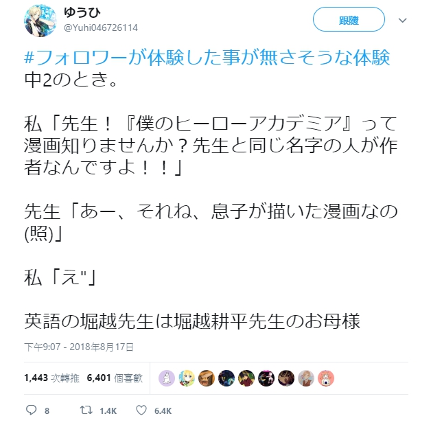 ▼「中學二年級時,我說"老師!你知道《我的英雄學院》這部漫畫嗎?作者是跟老師同樣名字的人呢!"