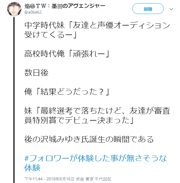 幾天之後,我問"試鏡的結果如何?"妹妹說"我在最後一關落選了,但是朋友得到評審特別獎,還決定要出道了"。這就是之後的澤城美雪誕生的瞬間。」澤城美雪是為《HUNTER×HUNTER 獵人》、《魯邦三世》、《福音戰士新劇場版:Q》配音的知名女聲優。