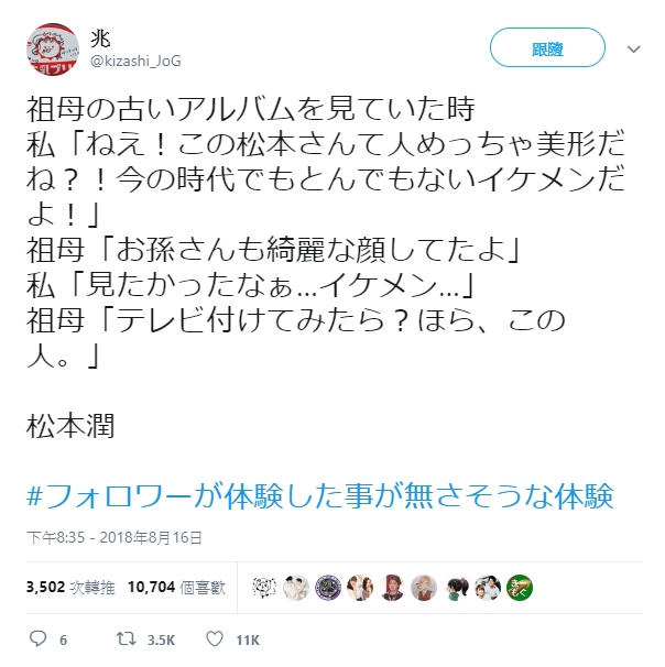 ▼「我在翻著祖母的舊相簿時,看到一張照片說"這個姓松本的人看起來未免太英俊了吧?!生在現在這個時代也會是一個不得了的大帥哥!"結果祖母回說"他的孫子也長著一張好看的臉呢",我回"真想看看啊...帥哥",祖母卻說"打開電視機就可以看到啦?你看,就是這個人"。結果孫子居然是松本潤。」
