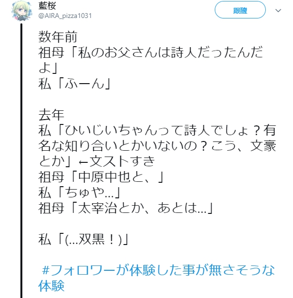 祖母說「中原中也啊、太宰治啊,還有呢...」嚇壞的我「...(雙黑!)」