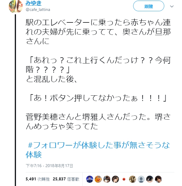 ▼在車站進電梯時,遇見了一對帶著小寶寶的夫婦,老婆對老公說:「咦?現在是往上嗎?現在是幾樓?」這樣一陣混亂之後,才說「啊!忘記按電梯鍵啦!」那一對夫妻是堺雅人和菅野美穗,當時堺雅人還在一旁笑到不行。