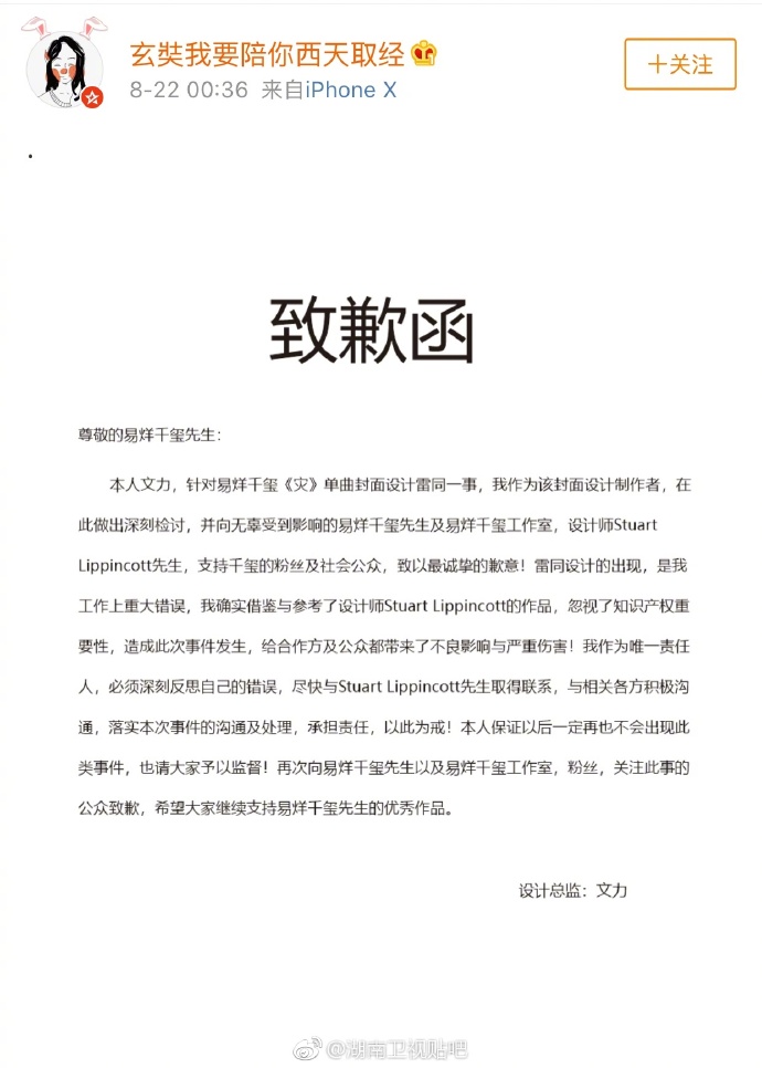 在設計總監文力的致歉文中,設計師坦承的確有參考Stuart Lippincott的原作,對於易烊千璽單曲封面設計涉嫌抄襲,他表示會深刻檢討,也希望此次紕漏不畏影響粉絲繼續支持易烊千璽。