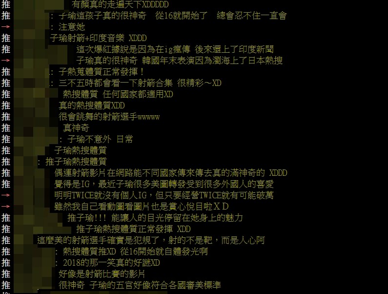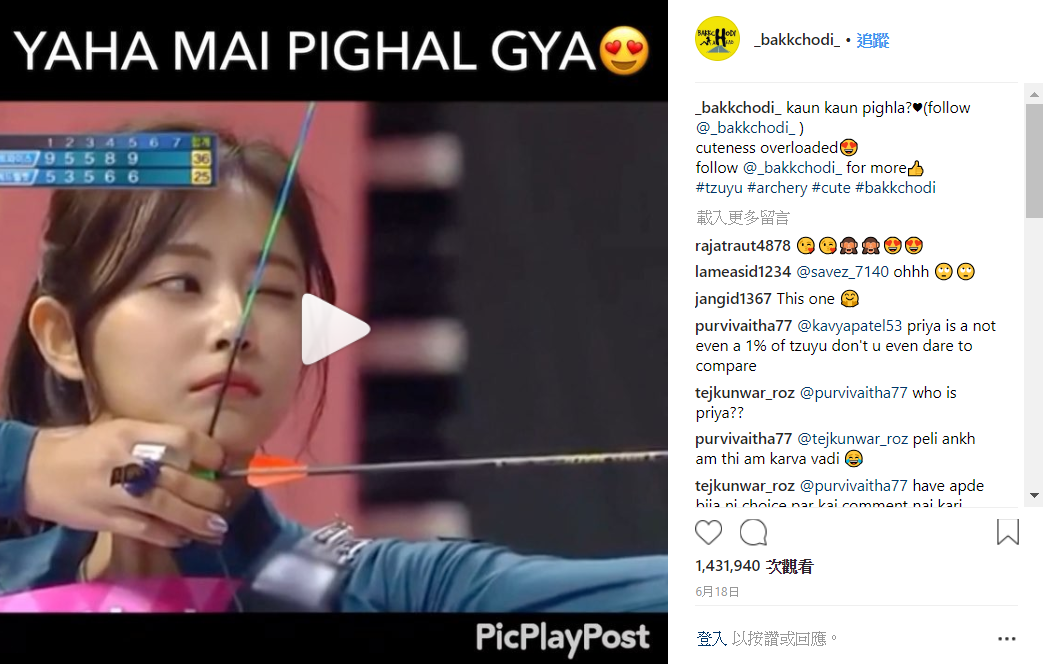 有粉絲就解答了他的疑惑,原來是先前ig上有個印度社群帳號翻出子瑜射箭飄髮的影片,因此影片又在印度突然瘋傳,當天還連po了三篇,累積了143萬人次觀看,讓子瑜一夕爆紅,還上了當地新聞,網路上甚至因此出現許多搭配印度音樂的子瑜影片,其中一支還有破萬讚數,還有人一度以為她是射箭選手。