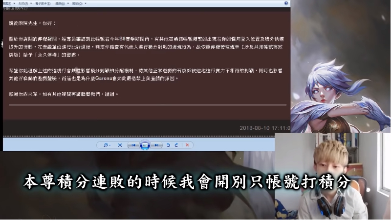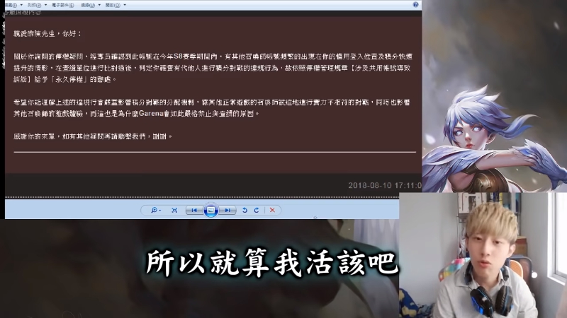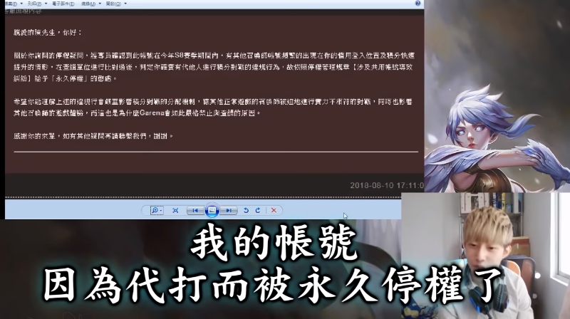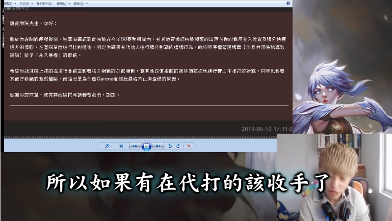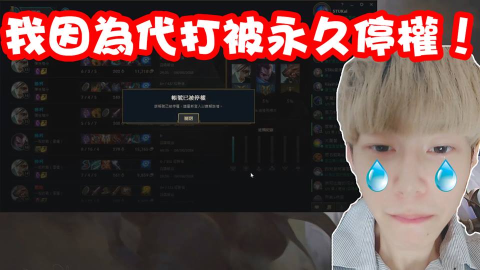 「台服最強雷文」一日登入遊戲時看到了自己的帳號被永久停權的通知,他趕緊去連絡客服人員,結果被告知因為他被查出有代打行為,同一個電腦IP登入數個帳號,且帳號都有短時間衝高積分的現象,進而判定違規才做出處分。他知道了以後坦白承認自己有時會代打,也嘆氣認命說「所以算我活該吧」