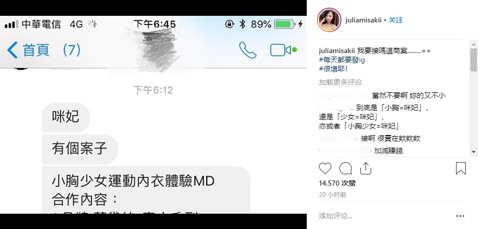 昨(21)日咪妃接到了一個廠商的業配案子,一點開竟然發現內容是「小胸少女的運動內衣體驗」,讓咪妃看了哭笑不得,猶豫到底該不該接下,還將與廠商的對話內容PO上IG,請粉絲們幫忙評評理,沒想到竟被群嘲 ! 網友開玩笑的勸她「幹嘛跟錢過不去⋯ 有工作自己上門不好嗎?」、「為了賺錢有些事情還是不要太執著的好,接吧!」、「為了生活⋯」更有人笑翻表示「最佳代言人非妳莫屬」、「廠商太會選角」