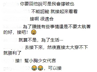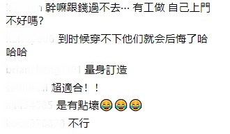 然而也是許多粉絲站在咪妃這邊,為她參謀出招,留言說「去接下來,然後直接太大穿不下就勝利了」、「接,讓廠商知道找錯人了!」、「接,然後說不行喔我穿有點撐」