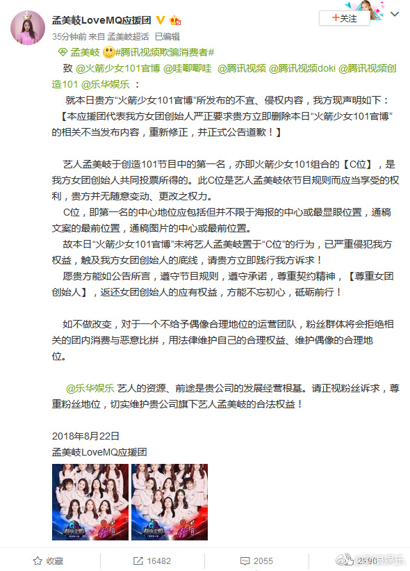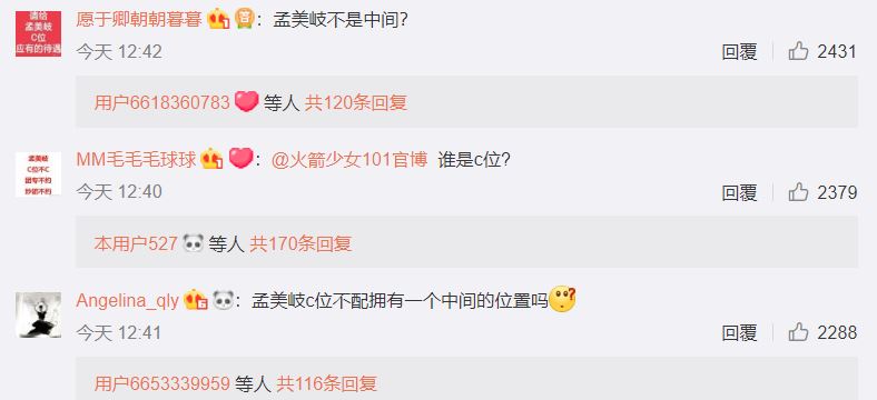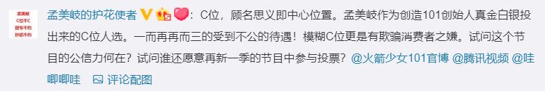 粉絲認為孟美歧以第一名出道,同時成為火箭少女的C位完全有賴於觀眾投票。聲明中還特地解釋C位意義,代表該成員在海報、圖片和文案都要在最前面,如今孟美岐沒有站在中心位置,讓粉絲覺得公司已經違反契約,甚至揚言要拒買任何火箭少女的周邊商品。