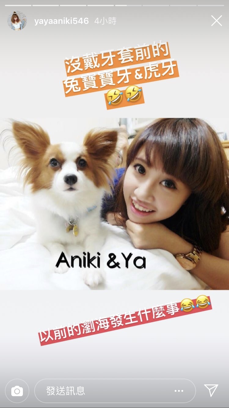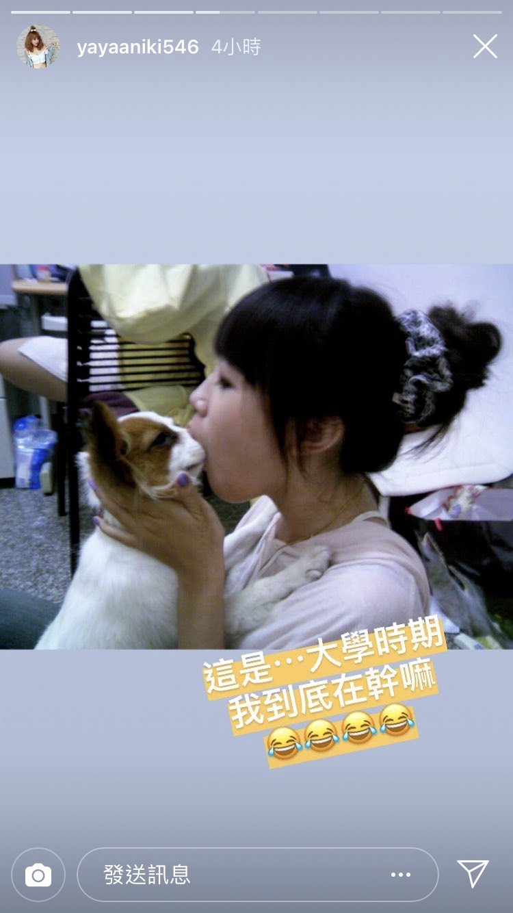 另一方面亞亞也發想了自己過去和愛犬Aniki的照片,她更搞笑自嘲:「以前的瀏海是發生什麼事」。不過有趣的是在另一張她和Aniki的照片中,她不僅捧著Aniki的臉,更直接含住牠的頭,Aniki則痴痴地望著她,超荒謬的合影也讓她搞笑表示:「這是...大學時期,我到底在幹嘛」。