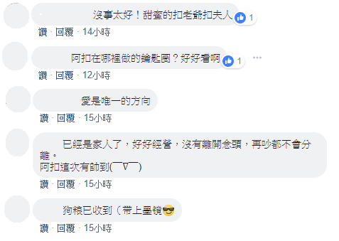 看見兩人和好後,粉絲也才放下心中的大石:「沒事太好!甜蜜的扣老爺扣夫人」、「阿扣在哪裡做的鑰匙圈?好好看啊」、「沒錯,獅子超配牡羊」、「夫妻就是這樣一起走過大風大浪」、「愛是唯一的方向」、「已經是家人了,好好經營,沒有離開念頭,再吵都不會分離。」、「狗粮已收到(带上墨镜」。