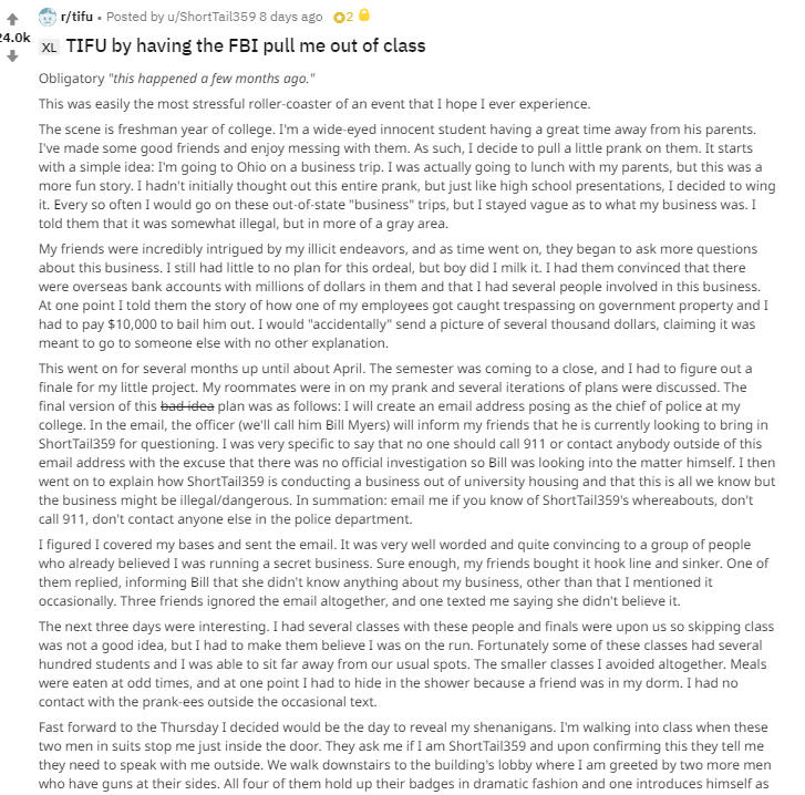 快轉到禮拜四,我決定要在這一天揭曉我的詭計。我走進教室時,兩個穿西裝的男人在門口就攔住我,他們問我是不是ShortTail359,然後告訴我他們需要跟我在外面說個話。來到大廳時另外兩個有配槍的人加入,他們四個以很戲劇性的方式拿出徽章,其中一個自我介紹是「FBI的Michael Scarn探員」(這裡寫的當然是假名了),在這個時候我終於意識到我有麻煩了,褲子裡還滴了幾滴尿。