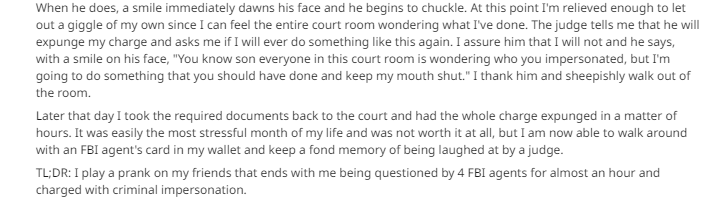 接著我帶著需要的文件去法庭消除記錄,整個過程花了幾個小時。這是我人生中最憂鬱的一個月,而且根本不值得。但最後我的錢包裡有一張FBI的名片,還有一段被法官嘲笑的有趣回憶。