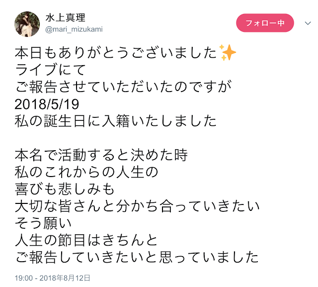 文中顯示Maika12日在現場演唱會上宣布,早在5月19日生日當天就和男友結婚了,卻隱瞞至今才向大家公布喜訊,不過她似乎相當重視這段感情,因此都沒透露男方的長相和名字。