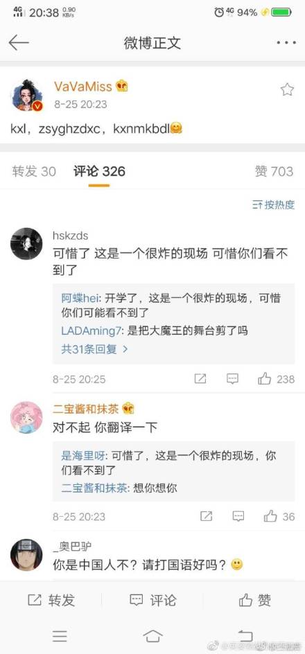 當天VAVA的精湛演出畫面被剪得一點不剩,讓她憤而發文抗議。VAVA當天炸翻全場的表演,讓劉柏辛慘失6強席位,然而演出畫面卻因為「不可抗力因素」全遭停播,VAVA還以亂碼發文到「kxl, zsyghzdxc, kxnmkbdl。」有網友猜測應是意指,「可惜了,這是一個很炸的現場,可惜你們看不到了」。
