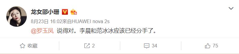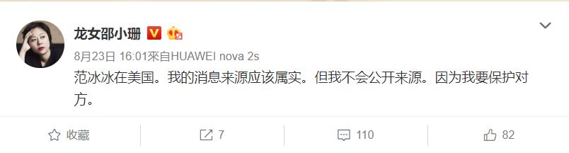 根據媒體報導范冰冰最新消息,23日,范冰冰昔日閨密邵小珊爆料范冰冰已經逃往美國,並且和男友李晨解除婚約。邵小珊在微博先後貼文表示,「李晨和范冰冰應該已經分手了」、「范冰冰在美國。我的消息來源應該屬實,但我不會公開來源,因為我要保護對方」。不過消息受到網友質疑,網友認為明明才遭限制出境怎麼可能待在美國,此外,有關兩人關係范冰冰和李晨本人都未發布聲明。