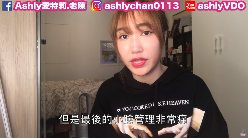 Ashly於3月中時,便在自己的頻道中分享自己的整骨心得。當時Ashly表示自己做的是臉型對稱的「小臉管理」,每次療程共兩小時,會先從骨盆矯正至背部、胸腹部、再來是皮膚保養,最後才是臉部的整骨。接著她也介紹到大家最關心的「會不會痛」,對此她表示前面的療程分常舒服「大概有9成時間都是在迷離狀態,真的舒服到不行,我都快睡著了」,不過到小臉就非常痛,更強調自己「好幾次我都是一邊做一邊流淚」。