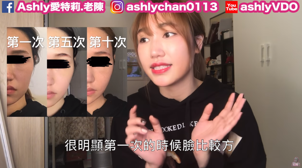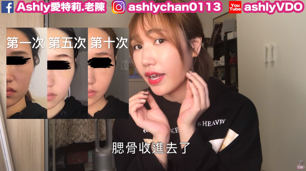 不過3月份時僅僅進行了十次療程,Ashly就非常滿意成果,只見她公開自己的整骨療程的紀錄照片,第一次、第五次、第十次的對比照便可看出效果十分顯著!她更開心比劃給網友看表示自己:「腮骨收進去了!」、「很明顯第一次的時候臉比較方,之後慢慢地下巴也變尖了」。五個月後,24日Ashly也公開自己完成20次療程的成果,她也說明完成全部的療程之後只要一兩月再回去一次就能永保V臉!