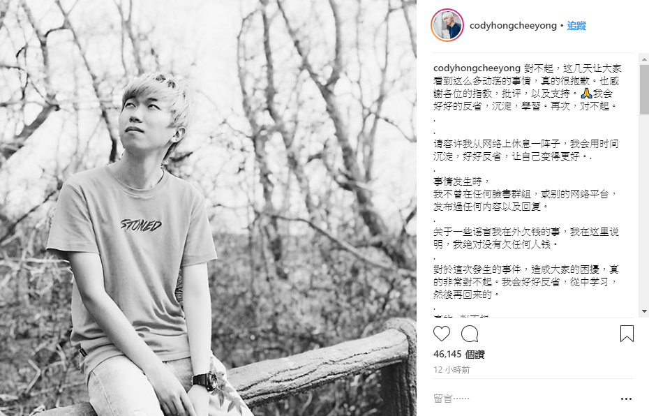 事情爆發之後Cody也多次回應,怎料仍無法平息風波,昨(27)日Cody透過IG發文再次道歉,更表示將會暫退網紅圈。只見Cody寫道:「這幾天讓大家看到這麼多動蕩的事情,真的很抱歉」,表示自己將會須接受網友的指教、批評,不過同時他也投下震撼彈,「請容許我從網絡上休息一陣子,我會用時間沉澱,好好反省,讓自己變得更好」。
